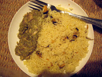 photo- all that was in the refrigerator for dinner last night. Rice with clams and mashed mystery meat with green sauce.